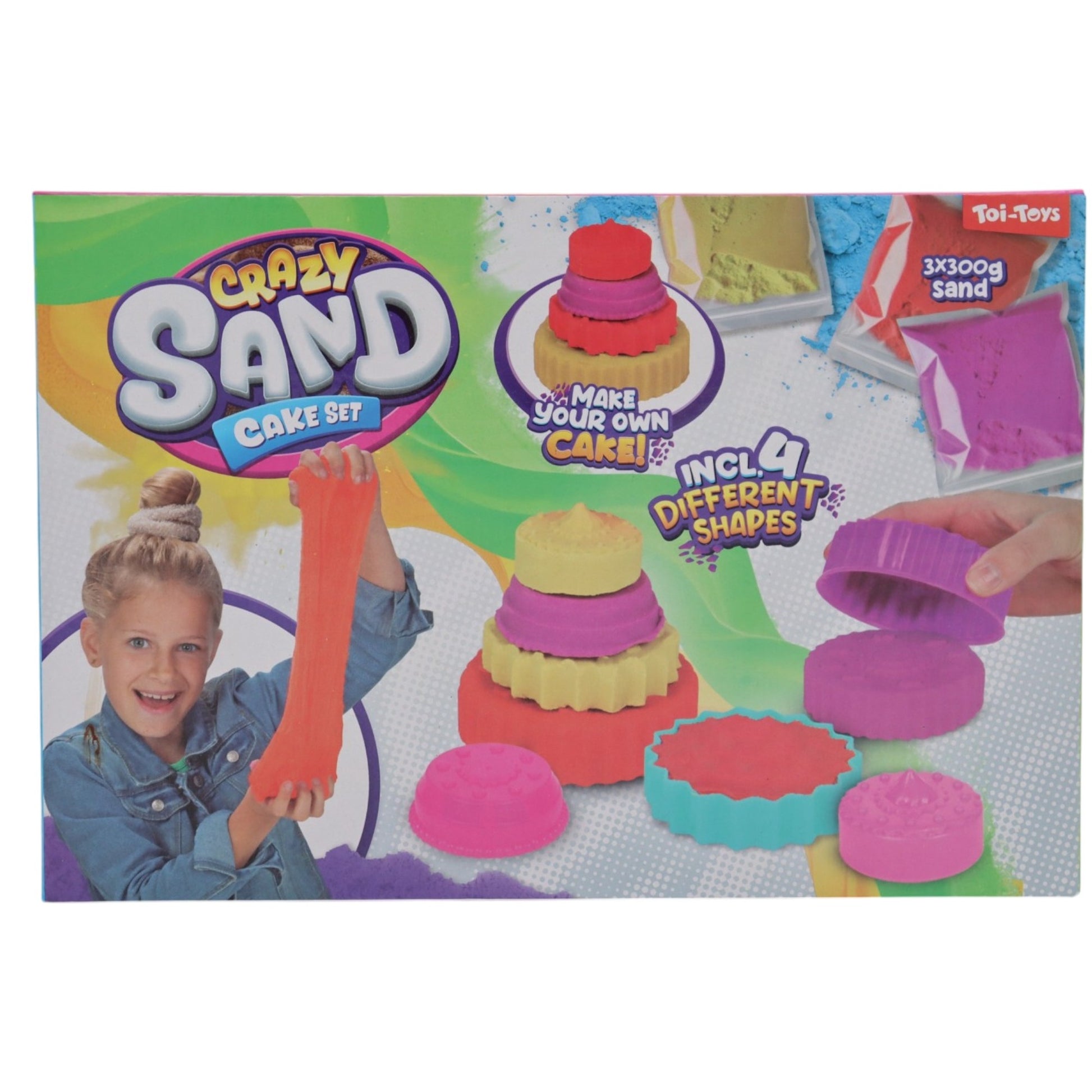 Sættet indeholder 4 forskellige forme, så du kan bygge og dekorere din drømmekage, samt 3 x 300 g farverigt, formbart sand, der kan bruges igen og igen.