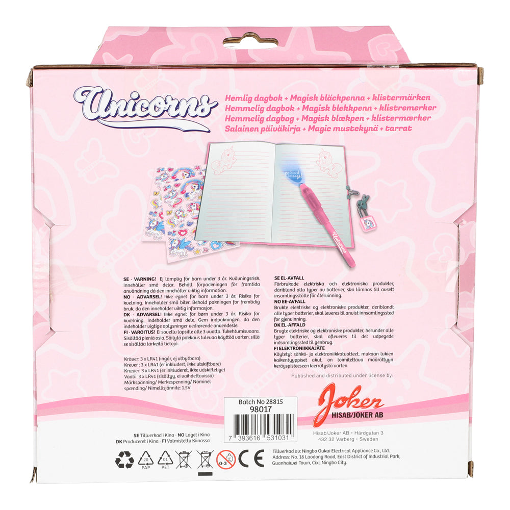 Dagbog med lås, pen og to ark klistermærker med søde enhjørningemotiver.