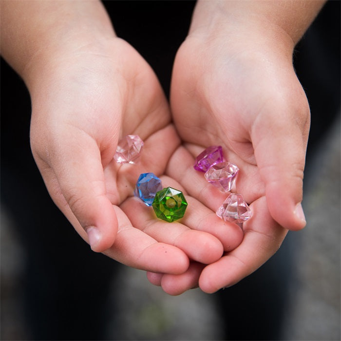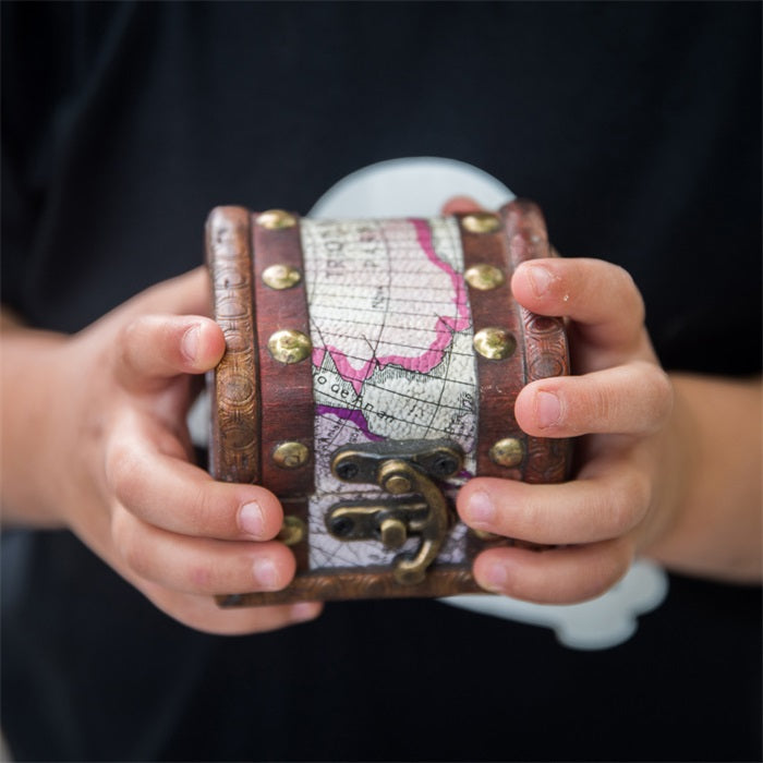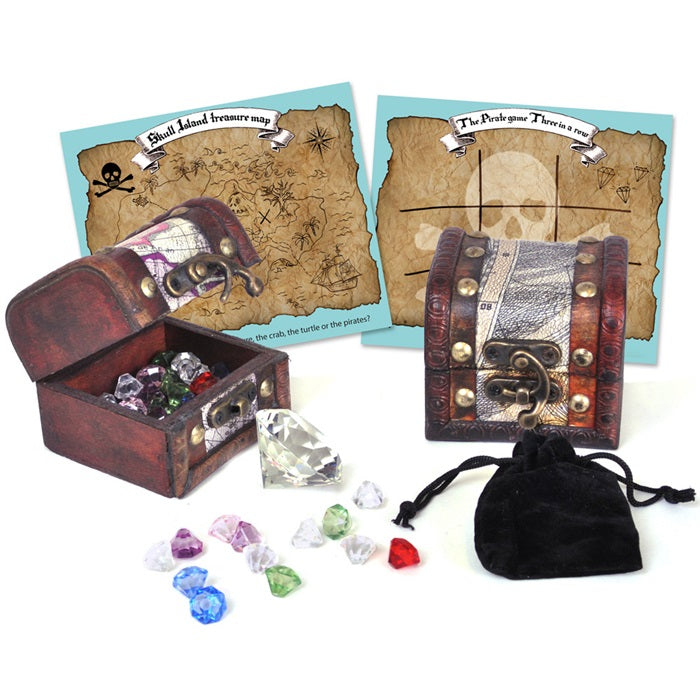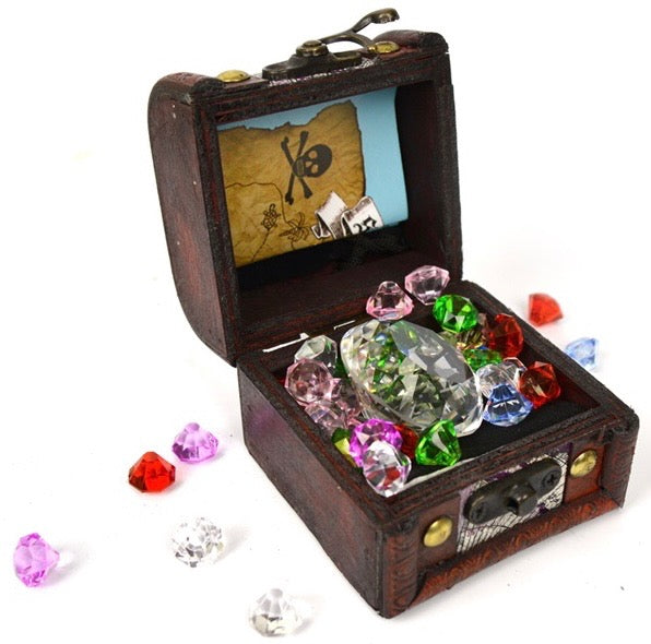 En skattekiste med flotte detaljer og en enkel lås. Indeni er der ca. 35–40 juveler, et skattekort og en lille fløjlspose.