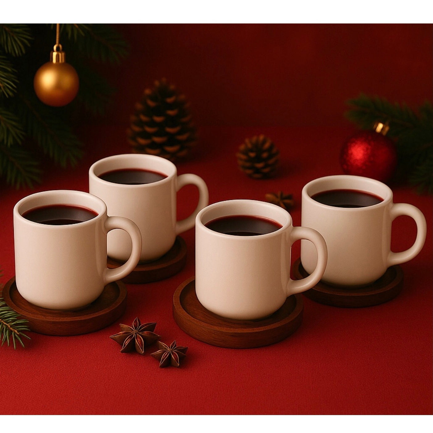 Skab ægte julestemning med et stilfuldt gløggsæt til små, varme serveringer. De slanke, hvide porcelænskrus suppleres af naturlige bordskånere i akacietræ – perfekt til adventshygge, gløggarrangementer eller stemningsfulde stunder efter middagen.