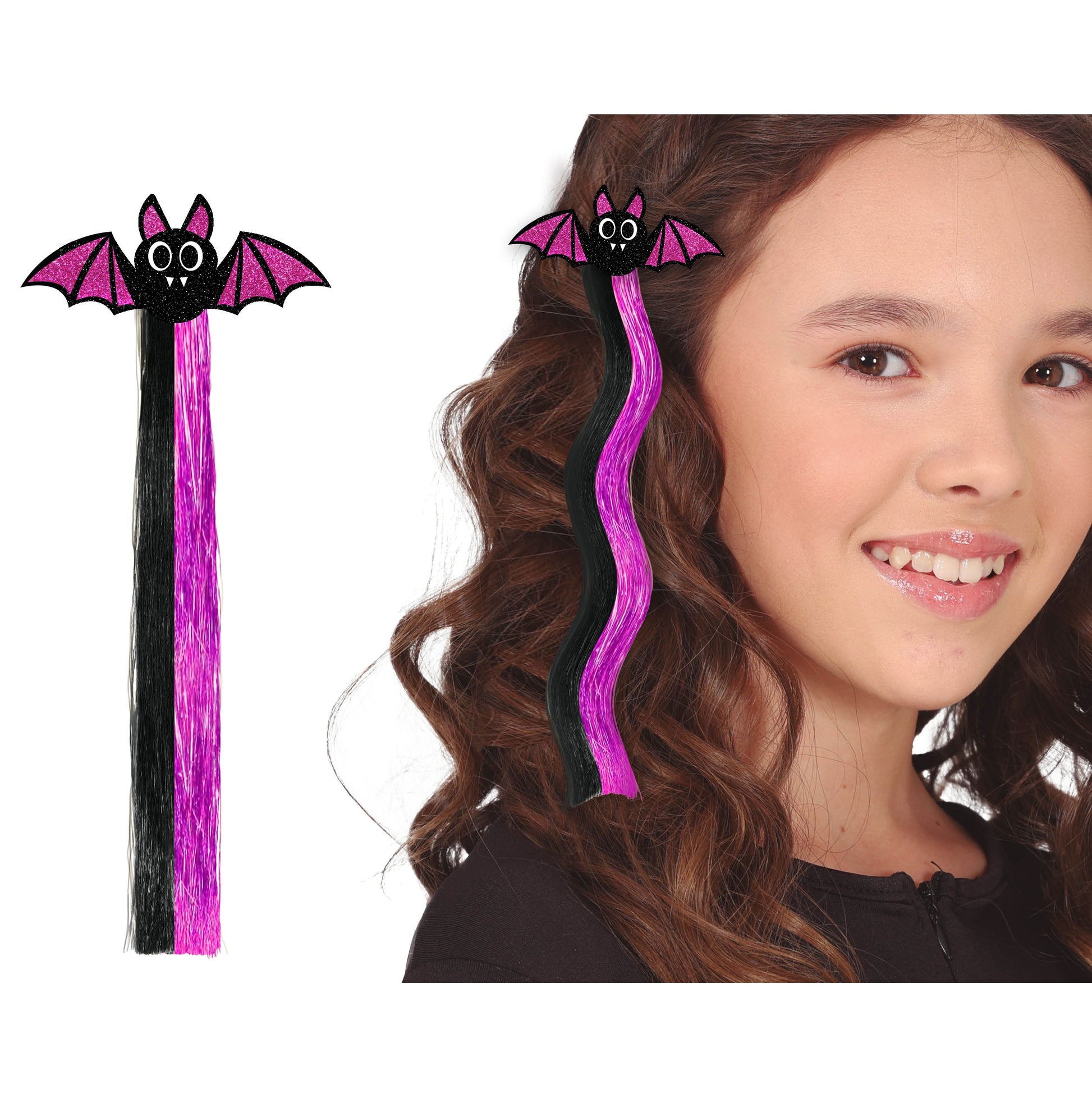 Giv din halloween-stil et magisk touch med disse hårforlængelser i lilla og sort! De er cirka 40 cm lange og pyntet med en sød flagermusdetalje, der gør din frisure både uhyggelig og stilfuld.