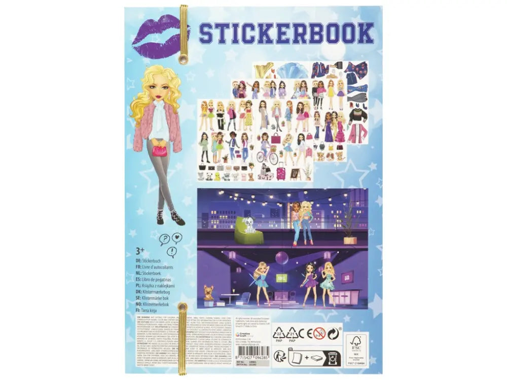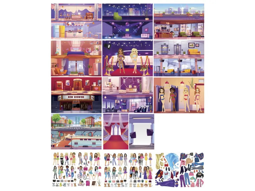Klistermærkebog med sider med forskellige miljøer samt masser af tøj og tilbehør.