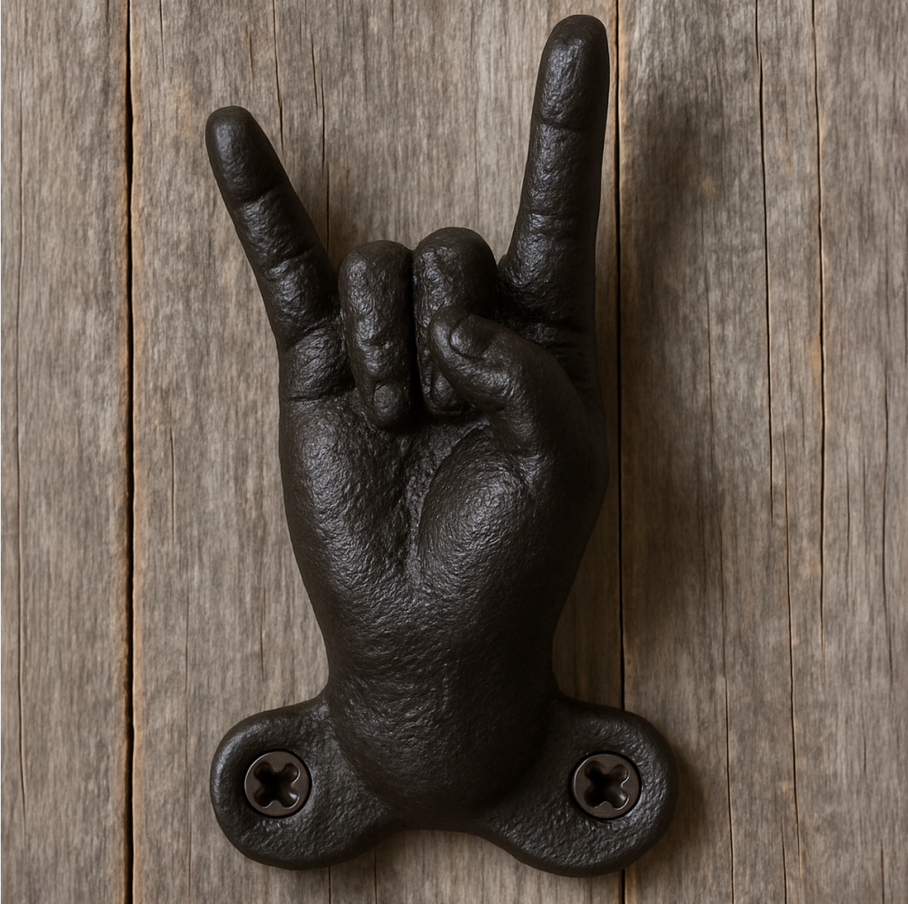 Lad rockens sjæl genlyde i hvert rum med denne kraftige krog i støbejern, formet som den ikoniske rock ’n’ roll-håndgest – en hyldest til alt, hvad rock er. Den solidt byggede krog måler 8,5 × 5 × 3 cm og er perfekt til ophængning af f.eks. jakker, tasker eller værktøj.