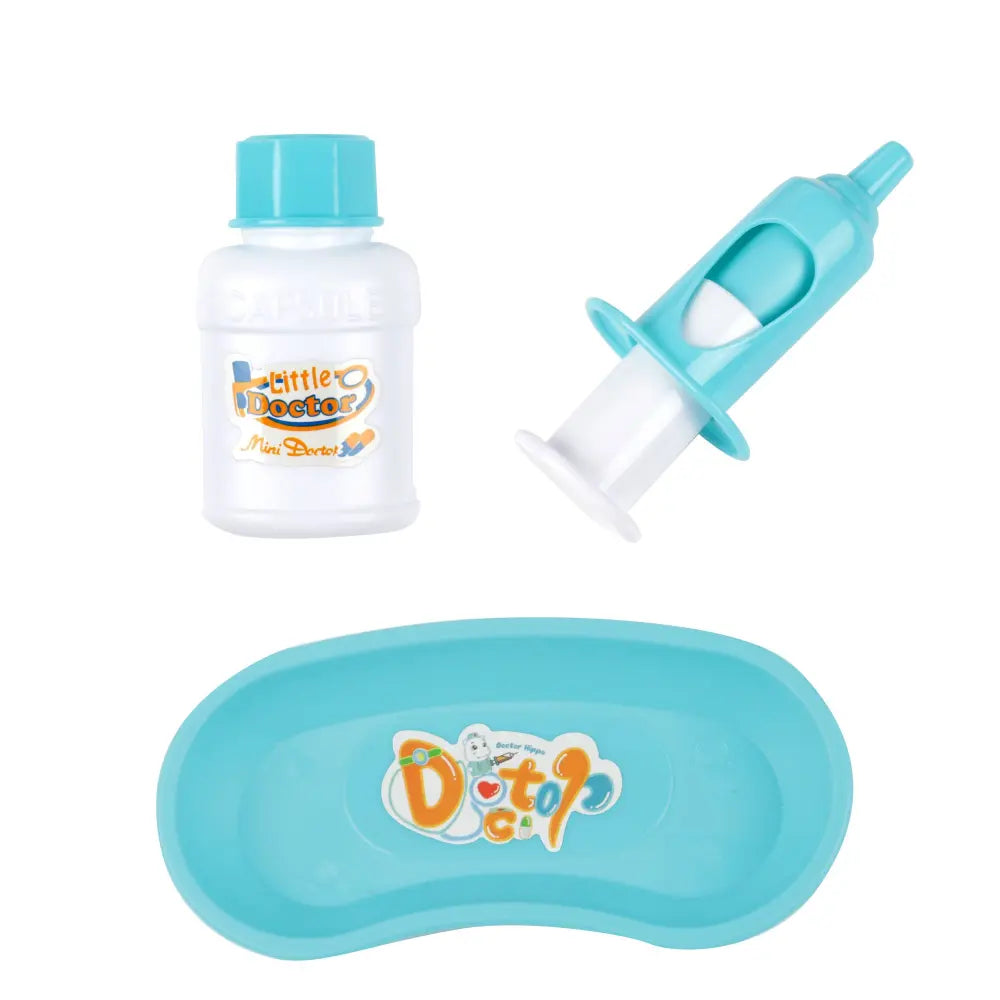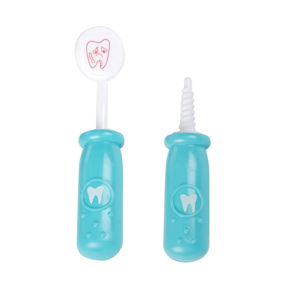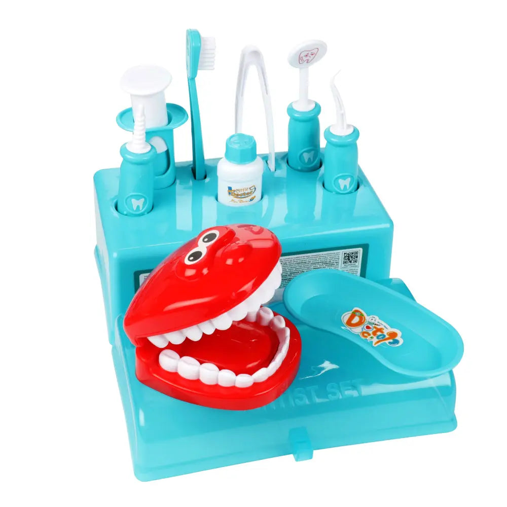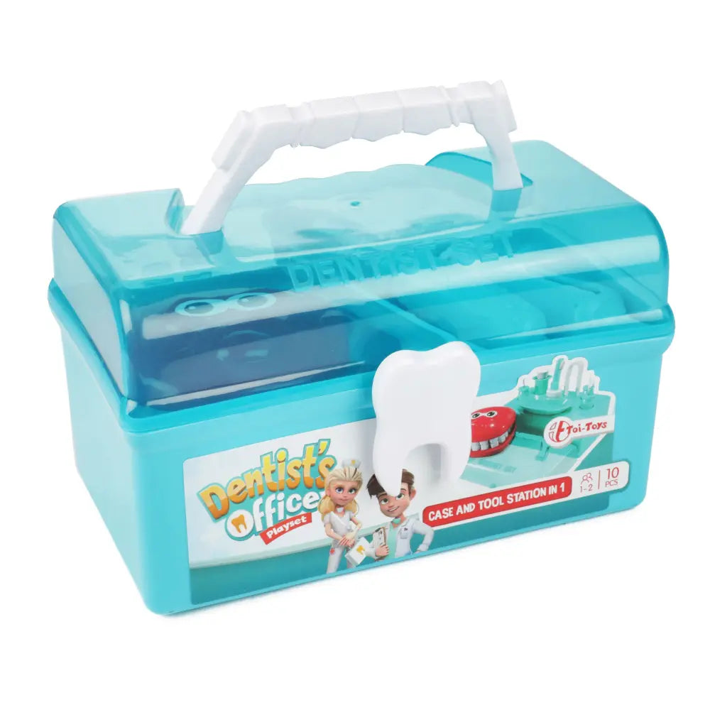 Legesæt med 10 tandlægeværktøjer i en kasse. Kassen kan bruges som værktøjsstativ.