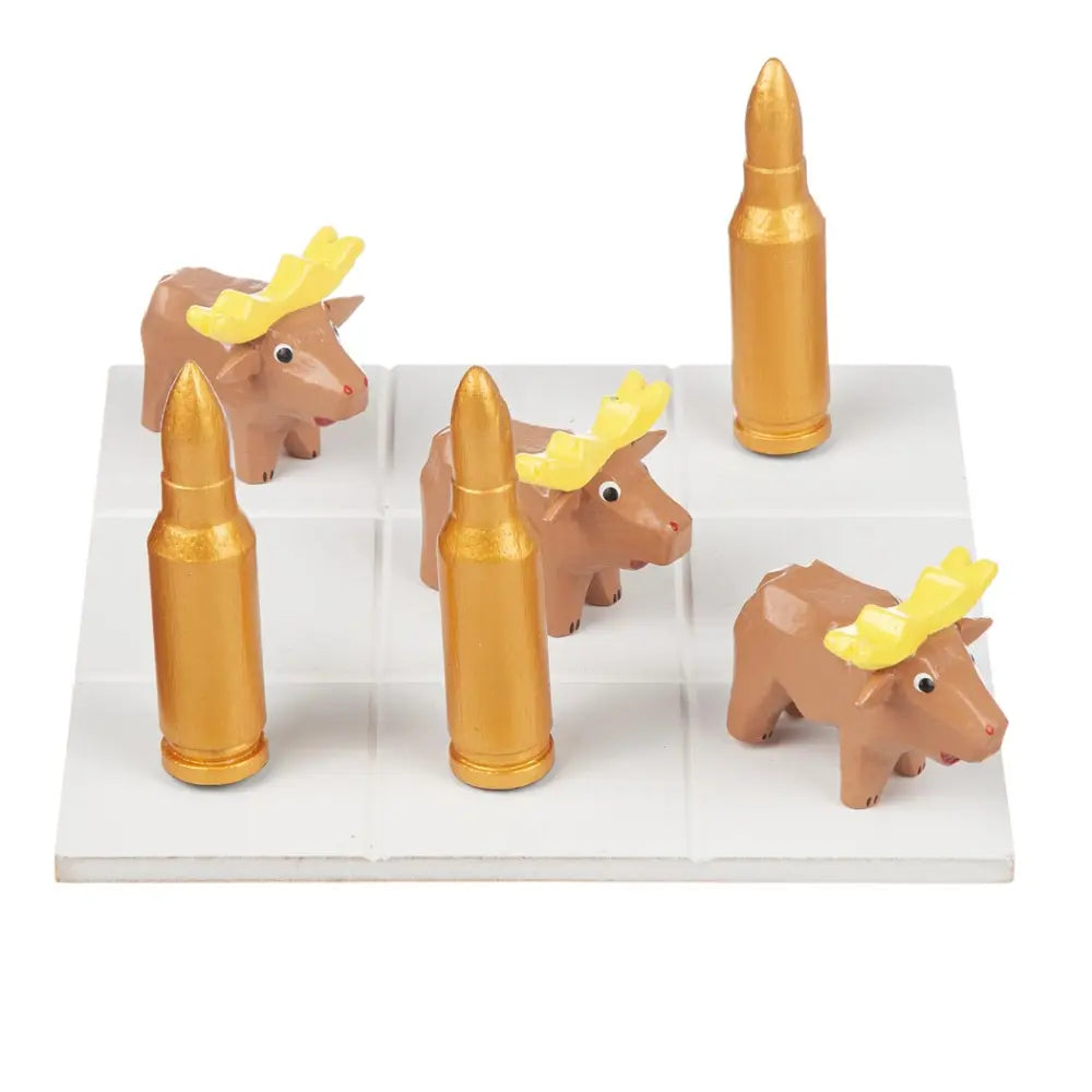 Det klassiske spil tre på stribe med patroner og elge som spillebrikker. Spillepladen er 19x19 cm. Materiale: træ. Leveres indpakket i cellofan, hvilket gør spillet perfekt som en gave.
