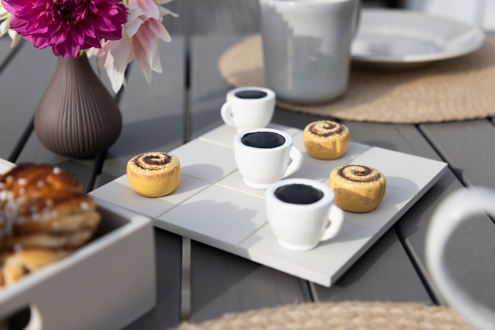 Det klassiske spil tre på stribe med lækre kanelboller og kaffekopper som brikker.